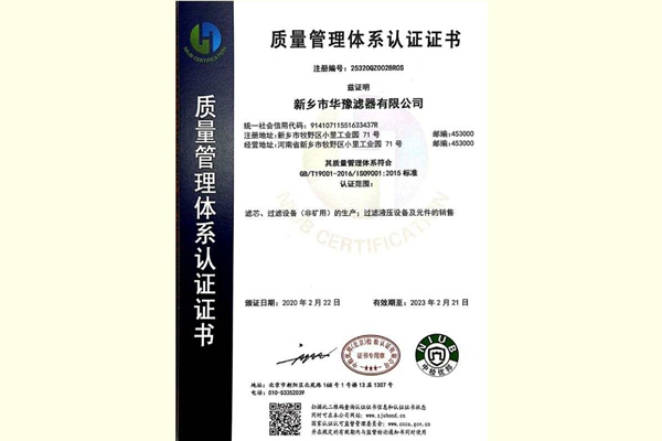 • 新鄉市華豫集團質量管理體系認證書