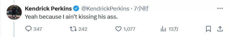 帕金斯隨后還在自己的推特上補充說:“是的,因為我不想拍他馬屁。”