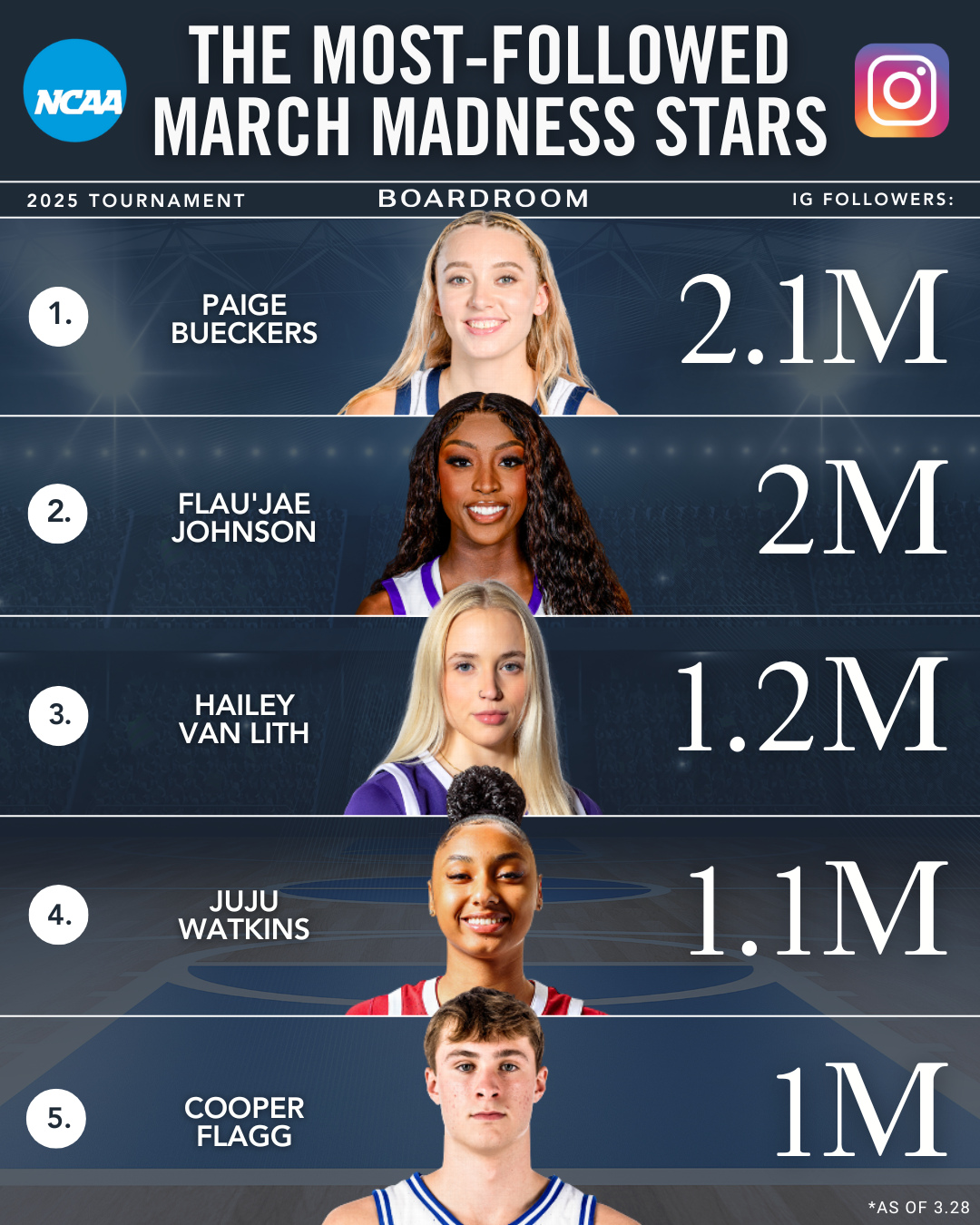 03月30日訊 美媒Boardroom今日統計了本屆NCAA瘋三球員的Instagram粉絲排名,NBA狀元大熱弗拉格以100萬粉絲排名第5,粉絲數“僅為”WNBA狀元大熱佩奇-布克斯的一半不到。