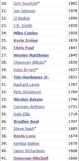 而在現役球員中,米切爾則排在第20,排在他前面的是樂福的1674記。
