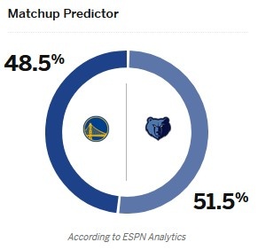 ESPN給出了本場比賽勝率預(yù)測,其中勇士48.5%,灰熊為51.5%。
