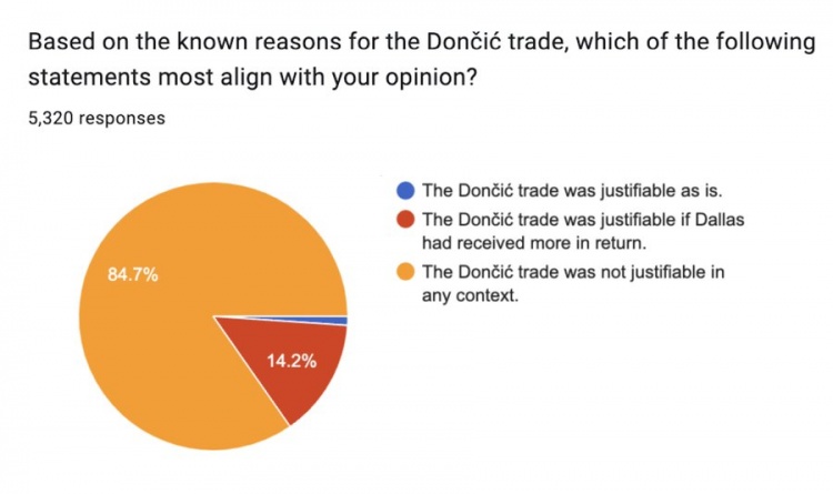 參與問卷調查的5320名球迷中,84.7%的球迷認為東契奇交易在任何情況下都說不過去,14.2%的球迷認為如果獨行俠獲得更多的回報,那么東契奇交易說得過去,認為東契奇交易說得過去的球迷只占1.1%。