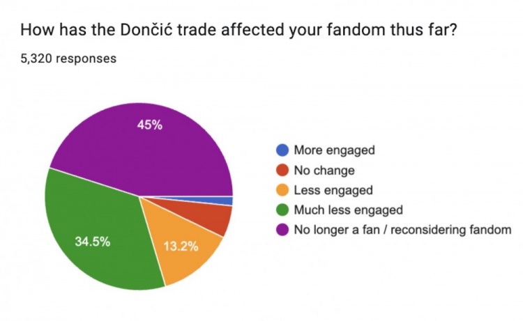 在東契奇交易如何影響你對球隊的喜愛這個問題上?45%的球迷表示不再是一名球迷或者要重新考慮自己的喜愛程度;34.5%表示自己現在參與度低多了,13.2%的球迷表示自己參與度略有降低,只有7.3%的球迷表示自己的喜愛度沒有變化或者參與度更高了。