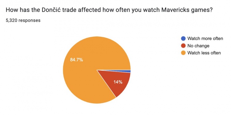 在東契奇交易如何影響你看獨行俠比賽這個問題上,84.7%的球迷表示已經較少看獨行俠的比賽,14%的球迷表示沒有變化,只有1.3%的球迷表示自己看的更多了。