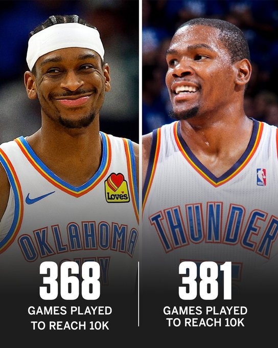 根據數據統計,亞歷山大歷時368場比賽解鎖雷霆生涯1萬分,他超越杜蘭特(381場),成為了隊史上(雷霆加超音速)解鎖1萬分最快的球員。