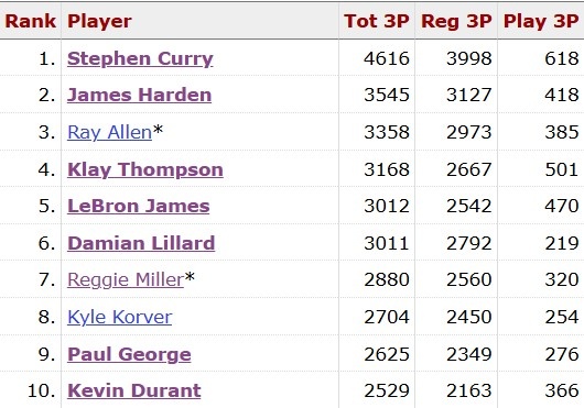 庫里常規賽和季后賽三分命中數來到4618記 距5000大關僅差382記