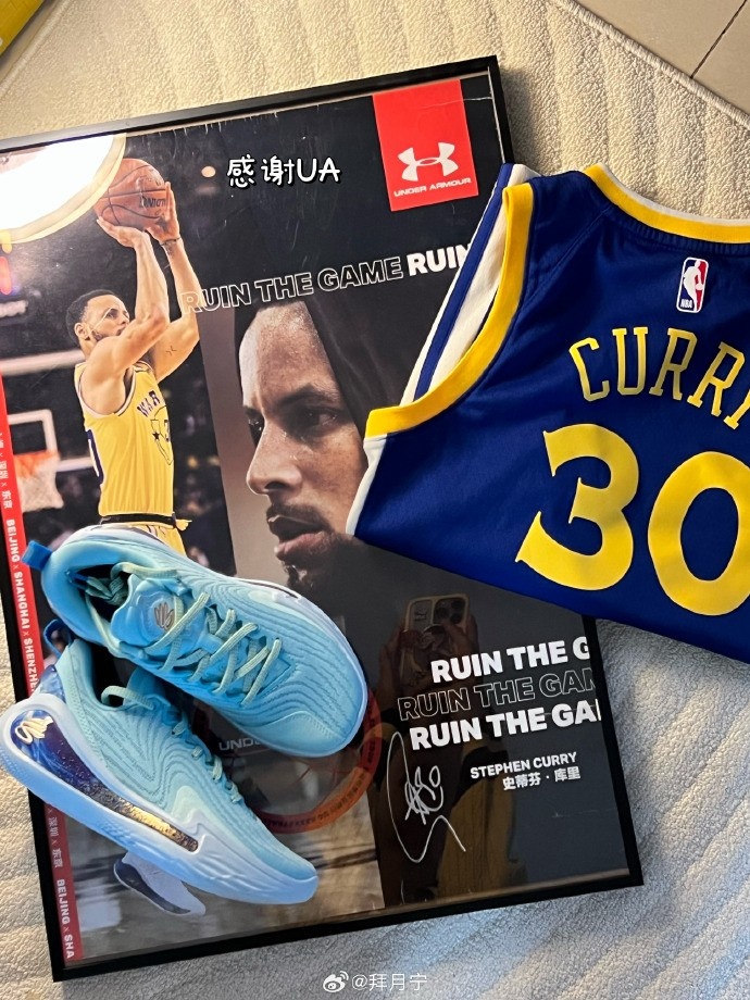 賽后,美女主播拜月寧曬出一組自己和庫里有關的照片,配文寫道:“庫里職業生涯的4000記三分球達成?
