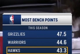 本賽季替補(bǔ)得分前3球隊:灰熊47.5分第1 勇士44.6第2 老鷹43.3第3