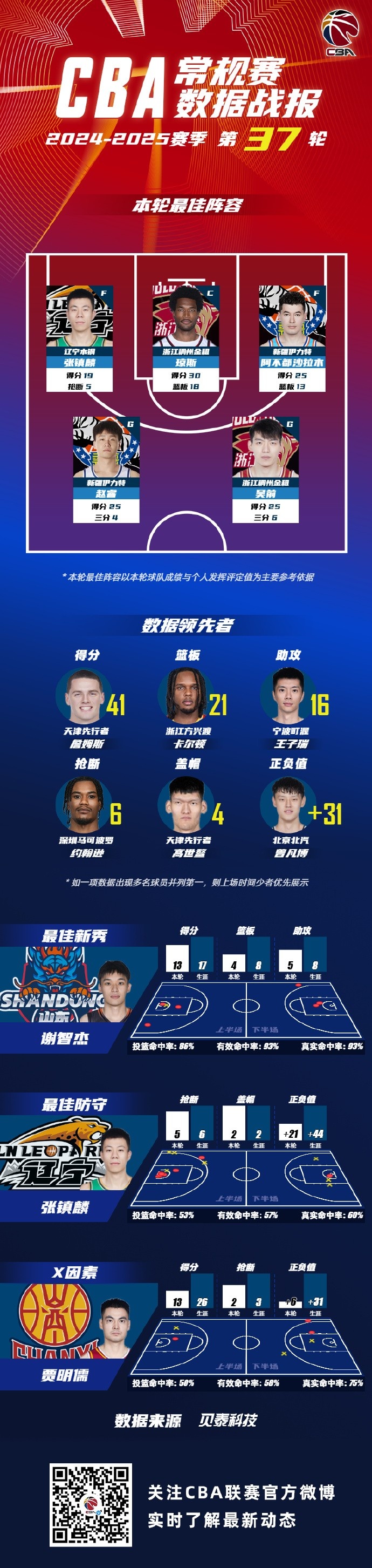 常規(guī)賽第37輪最佳陣容:張鎮(zhèn)麟&吳前&瓊斯&趙睿&阿不都
