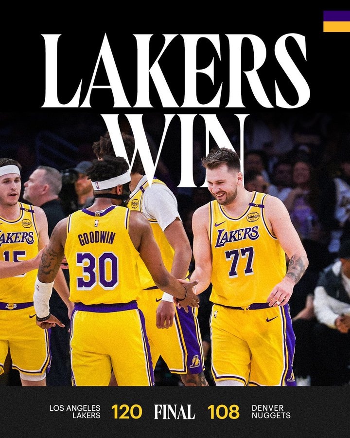 賽后湖人官方曬出贏球海報,東契奇、里夫斯、古德溫和海斯登上封面。