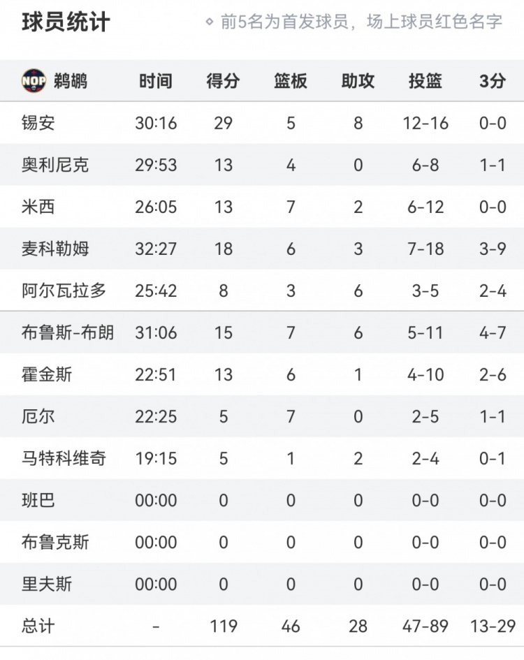 本場比賽,鵜鶘全隊(duì)多點(diǎn)開花,共6人得分上雙。具體如下: