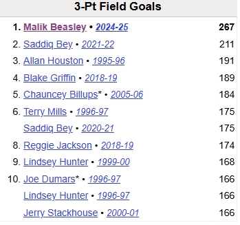 以上為本場賽前活塞隊史單賽季三分命中數前十