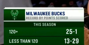 本賽季雄鹿得分120+的比賽25勝1負 得分少于120分的比賽13勝29負