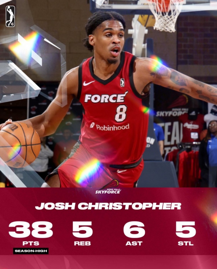 此役,前火箭球員克里斯托弗(現效力于蘇福爾斯天力、熱火下屬G聯盟球隊)出戰39分18秒,投籃22中13,三分9中7,罰球2中2,爆砍38分5籃板6助攻5搶斷2蓋帽。