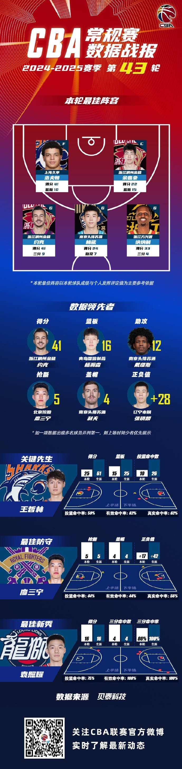 數據領先者方面:浙江稠州金租球員約克以單場41分的數據領銜得分榜;