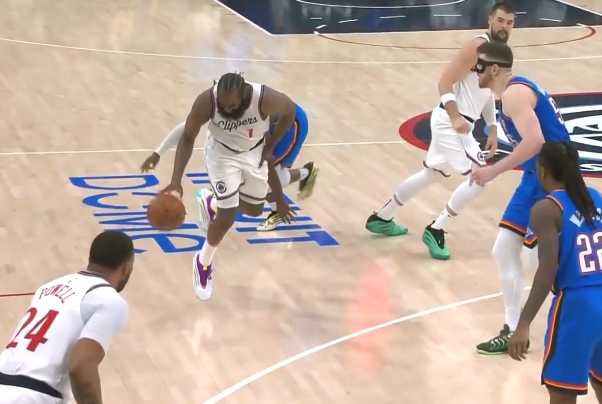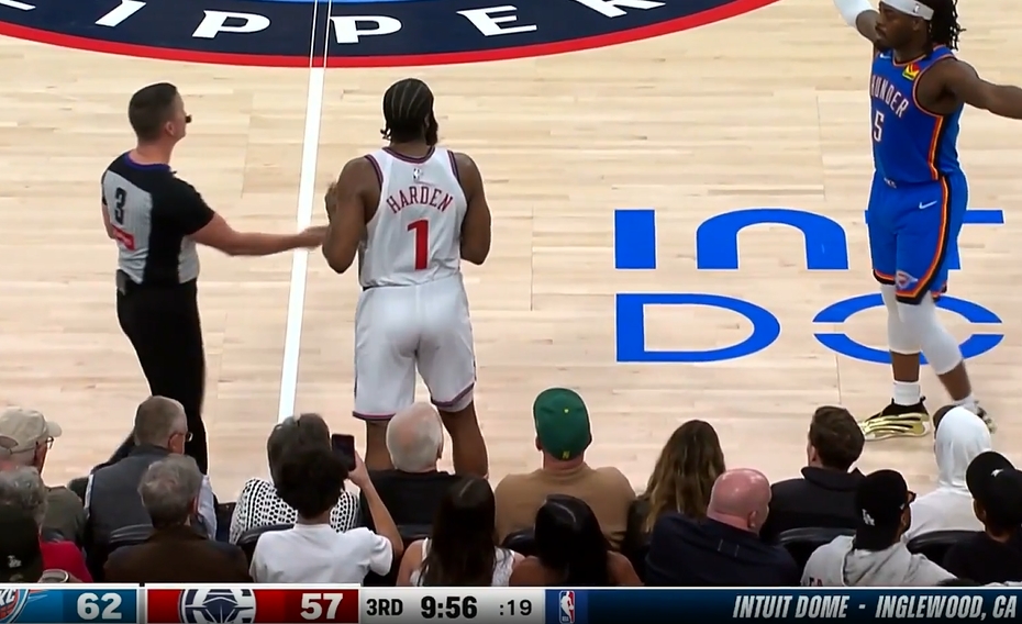 被多特貼身頂翻!哈登捂著自己的大腿痛苦倒地!好在無礙繼續比賽