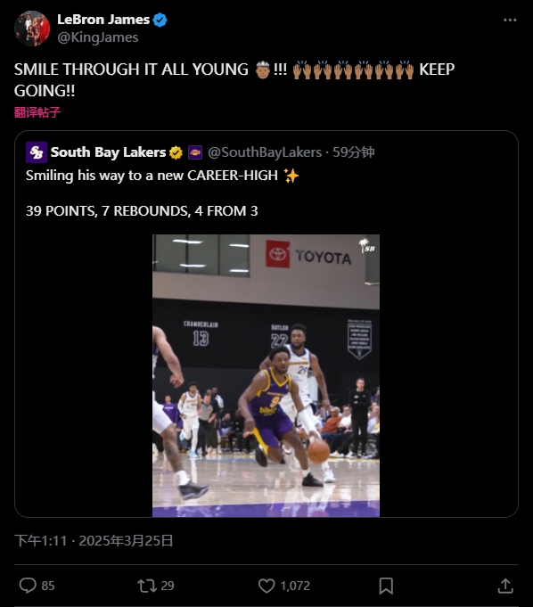 賽后,詹姆斯轉發了布朗尼的賽場集錦并寫道:“保持微笑,繼續前進,年輕的王子!加油!”