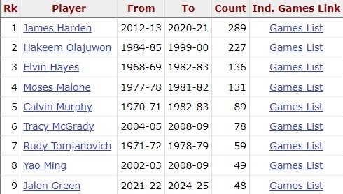 據(jù)統(tǒng)計(jì),這是杰倫-格林生涯第49場(chǎng)比賽30+,追平姚明,并列火箭隊(duì)史第8位。