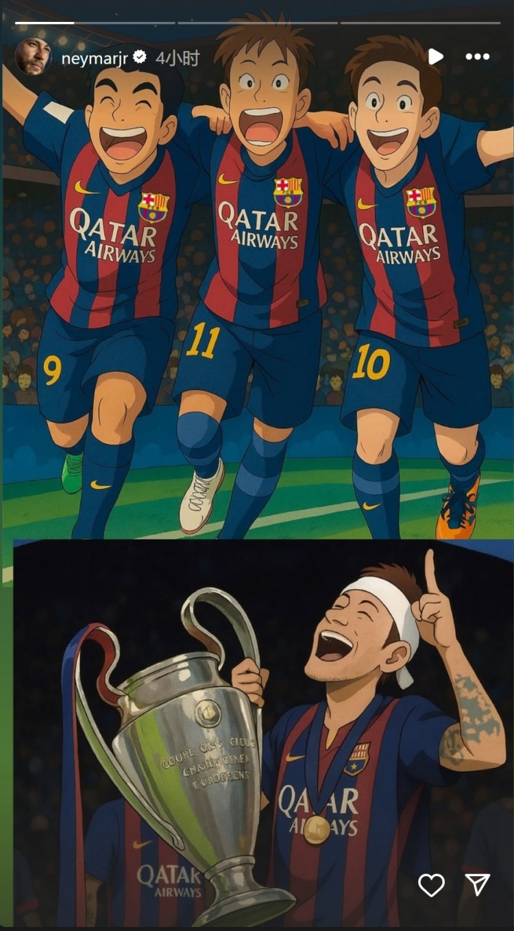 內馬爾在社交媒體上曬出與梅西、蘇亞雷斯一起慶祝,以及自己手拿歐冠獎杯的漫畫圖片,追憶那段美好的時光。