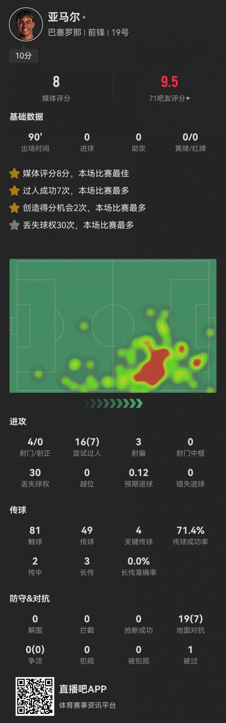 亞馬爾本場4射0正+4關鍵傳球 7成功過人+2造良機+30次丟失球權