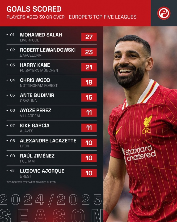 本賽季五大聯賽僅3名30+球員打進20+聯賽進球:薩拉赫、萊萬、凱恩