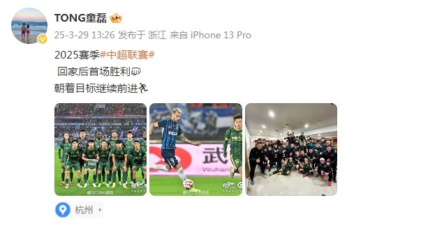 3月29日訊 在中超聯賽第3輪中,浙江隊客場4-0大勝武漢三鎮,本場也是浙江隊在本賽季的首勝。比賽結束轉天,童磊更新微博,慶祝球隊取勝。