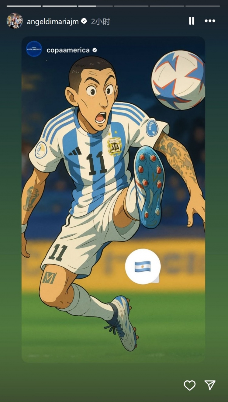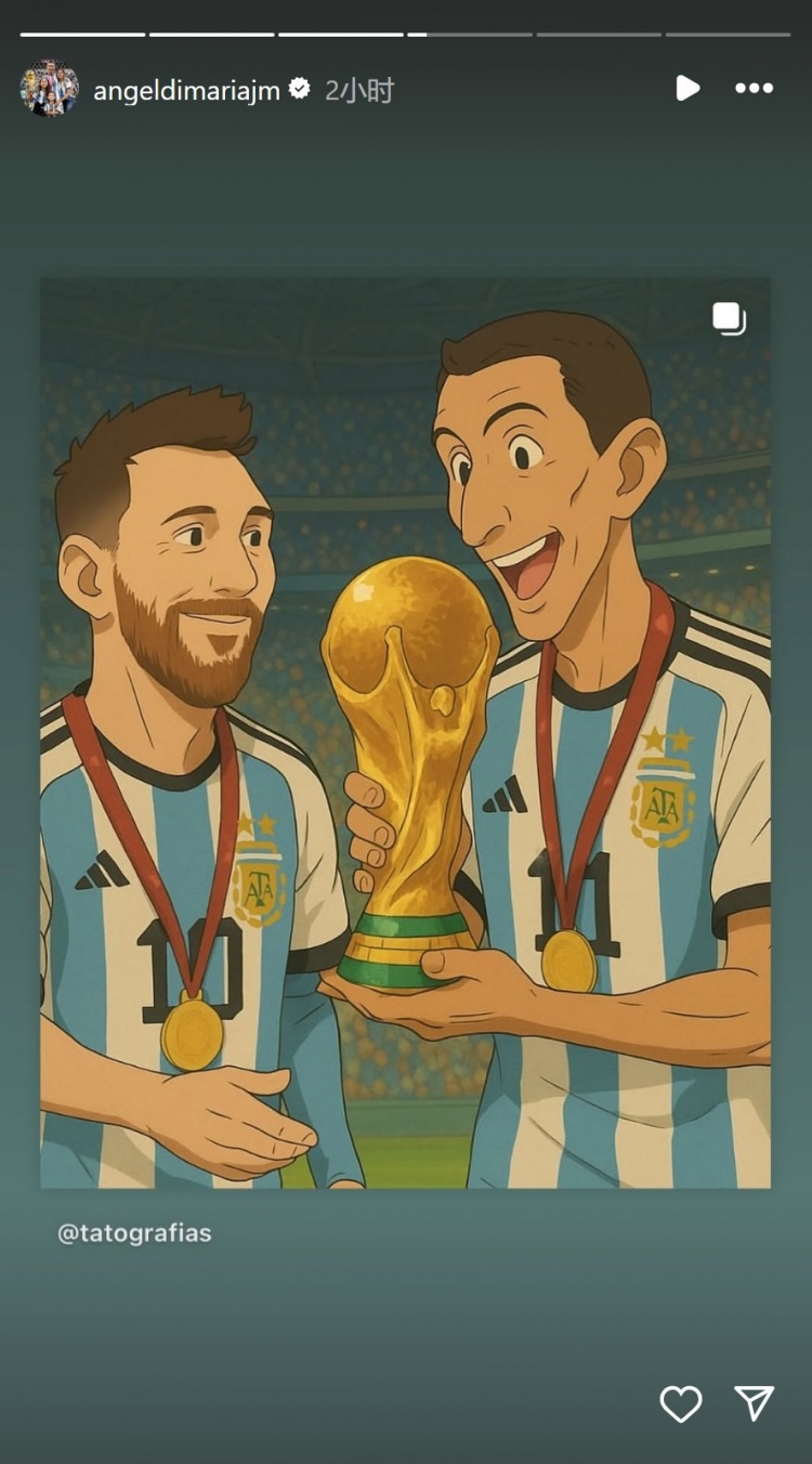 3月29日訊 迪馬利亞更新社媒動態(tài),轉發(fā)與梅西手捧大力神杯的AI漫畫圖片。
