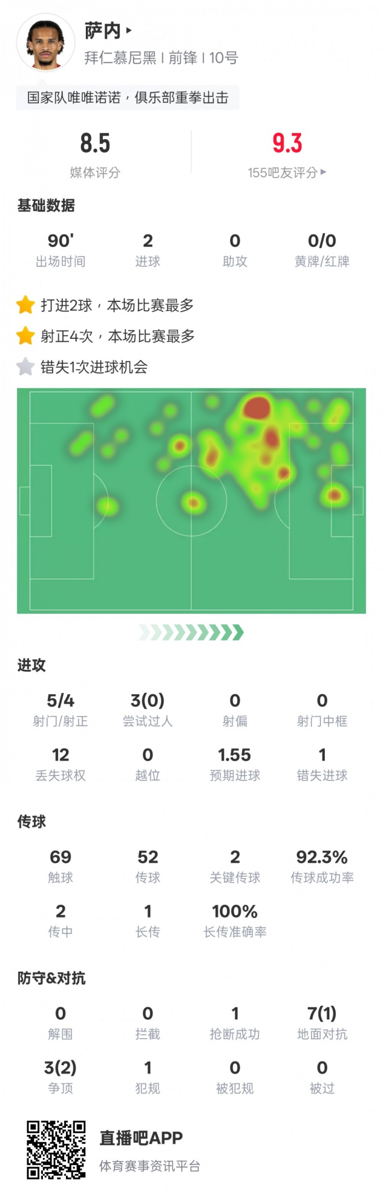 薩內(nèi)本場數(shù)據(jù):2進球2關鍵傳球&錯失1次進球機會,評分8.5