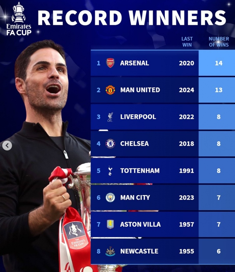 德轉列足總杯歷史奪冠榜:阿森納壓曼聯居首,曼城&維拉各7冠