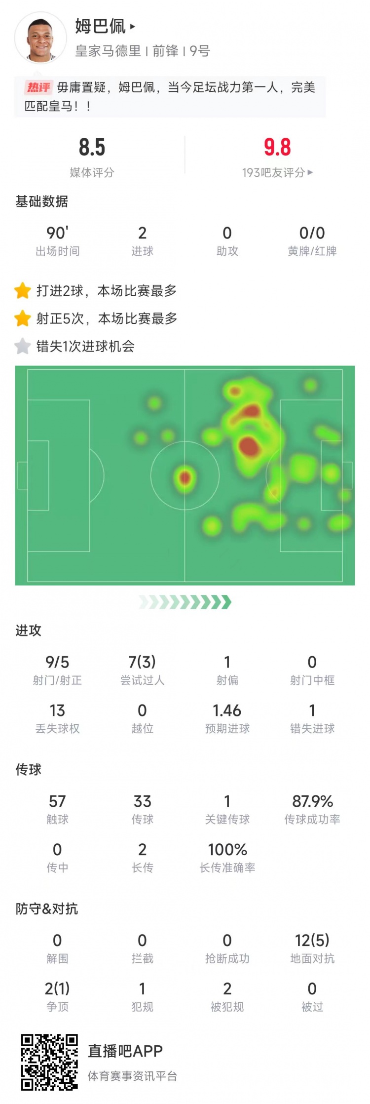 貝林數(shù)據(jù):1進球,5次過人全成功,14次成功對抗,全場最高9.2分