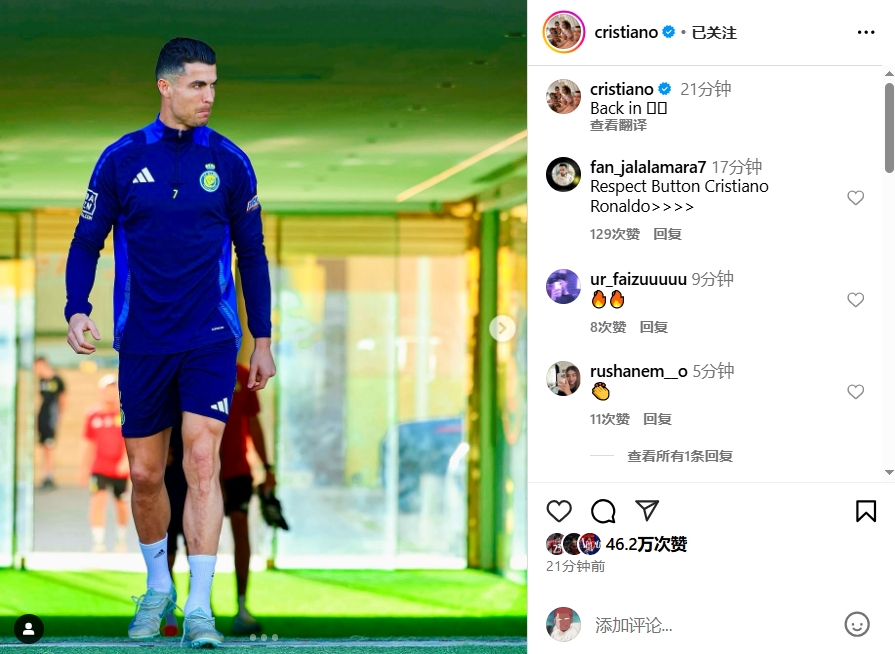 3月30日訊 今日C羅更新社媒,曬出自己身穿利雅得勝利訓練服的照片,并配文Back in。