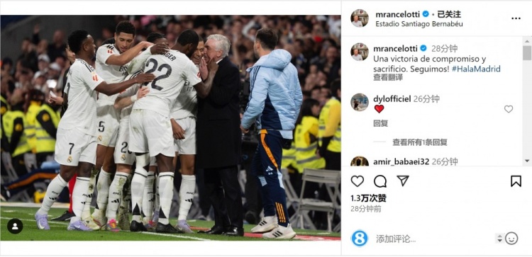 皇馬主帥安切洛蒂社媒曬出與球員們慶祝的照片,并配文:“一場奉獻和犧牲精神帶來的勝利,我們繼續(xù)前進!”