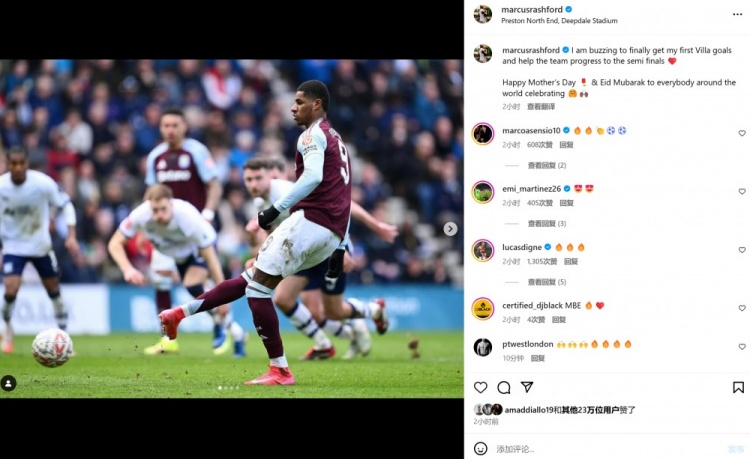 拉什福德賽后也在個(gè)人社媒曬出本場(chǎng)照片,配文寫道:“非常激動(dòng)終于收獲在維拉首粒進(jìn)球,并且?guī)椭蜿?duì)晉級(jí)半決賽。祝大家母親節(jié)&開齋節(jié)快樂。”
