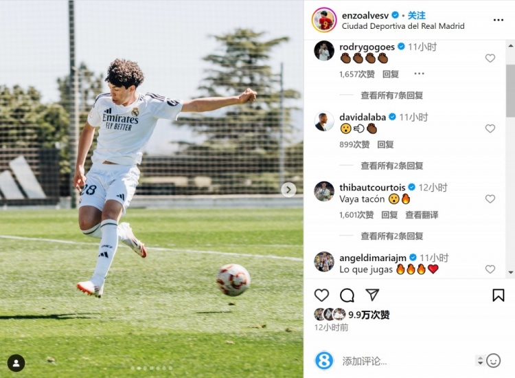 恩佐-阿爾維斯在對陣馬競U19的比賽中上演皇馬U19首秀,并貢獻腳后跟助攻,賽后他在社交媒體上曬出自己的賽場照片,配文:“感恩并自豪能身穿皇馬球衣。”