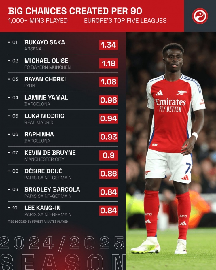 4月1日訊 Squawka統計了本賽季五大聯賽球員每90分鐘創造重大機會的次數,薩卡1.34次居首,奧利塞1.18次第二。
