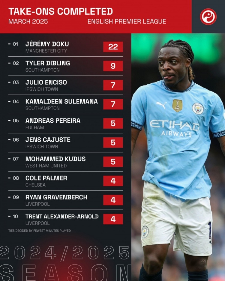 英超3月成功過人排名:多庫22次斷層居首,迪布林9次第二