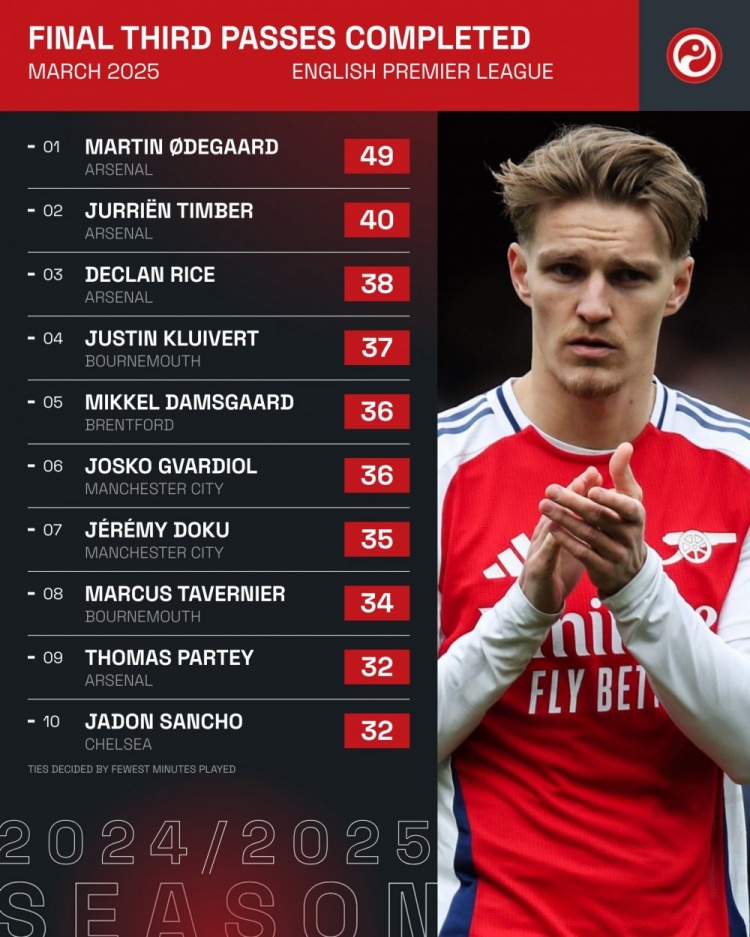 英超3月進攻三區成功傳球排名:厄德高49次居首,阿森納包攬前三