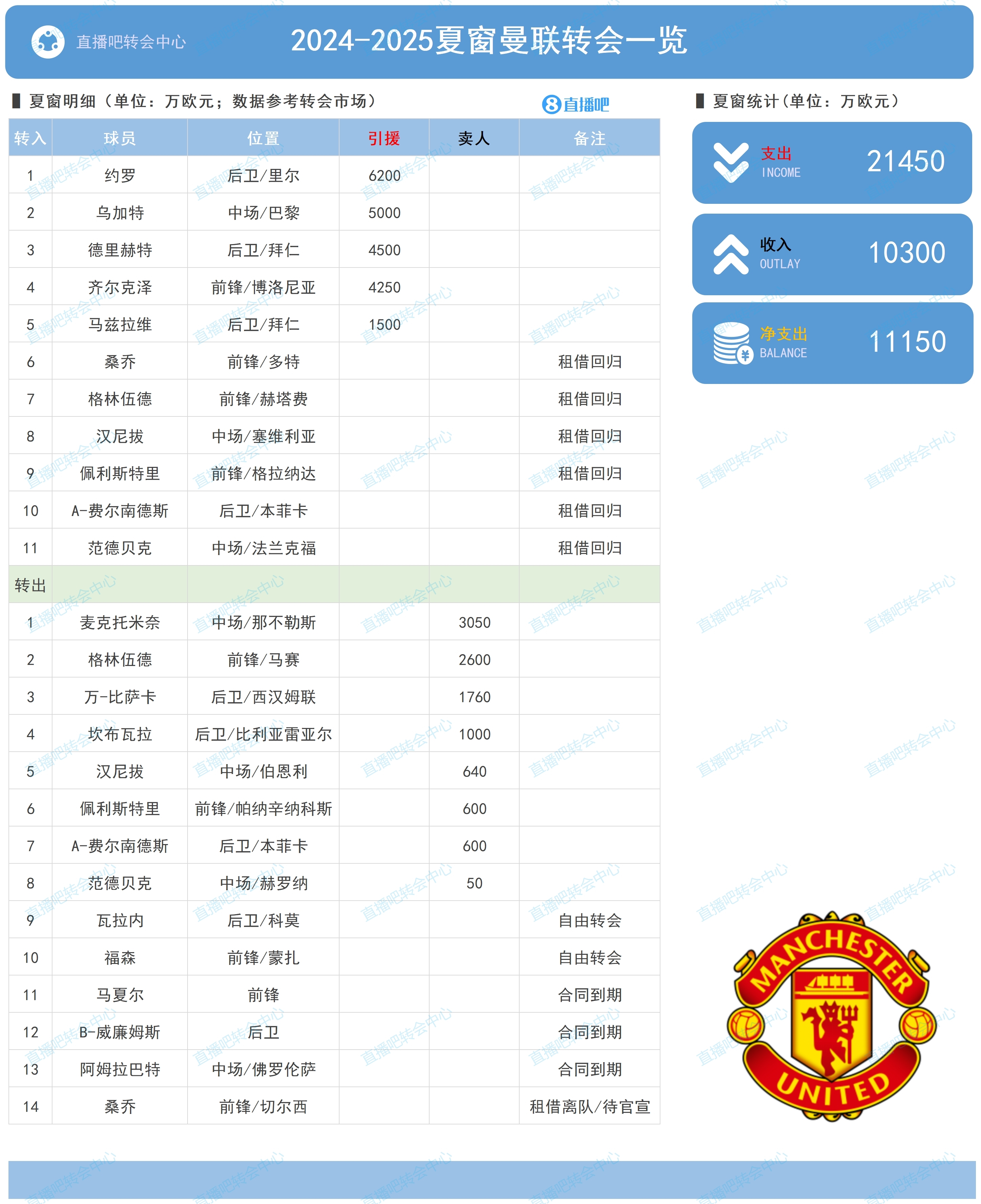 曼聯去年夏天引援如圖,荷蘭球員有德里赫特(4500萬歐)和齊爾克澤(4250萬歐)。