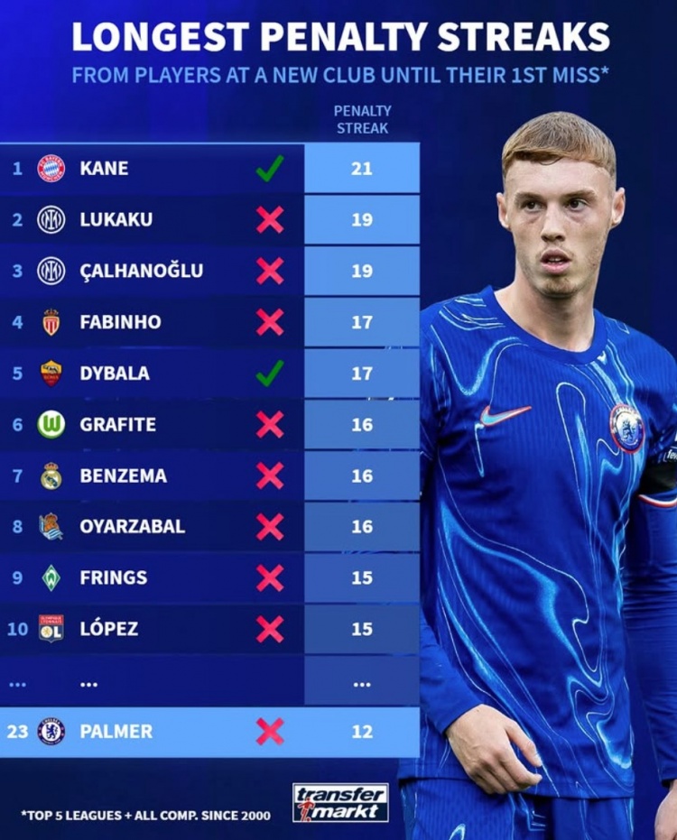 《轉會市場》統計了新世紀以來五大聯賽球員在新東家在不罰丟情況下連續命中點球紀錄,凱恩21球居首并且仍未罰丟。