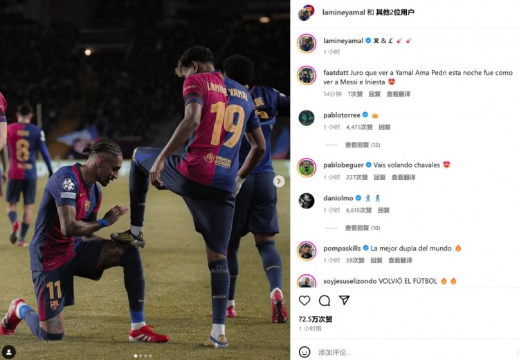 起飛!巴薩兩大邊鋒社媒互動,同時曬出拉菲尼亞為亞馬爾擦鞋照
