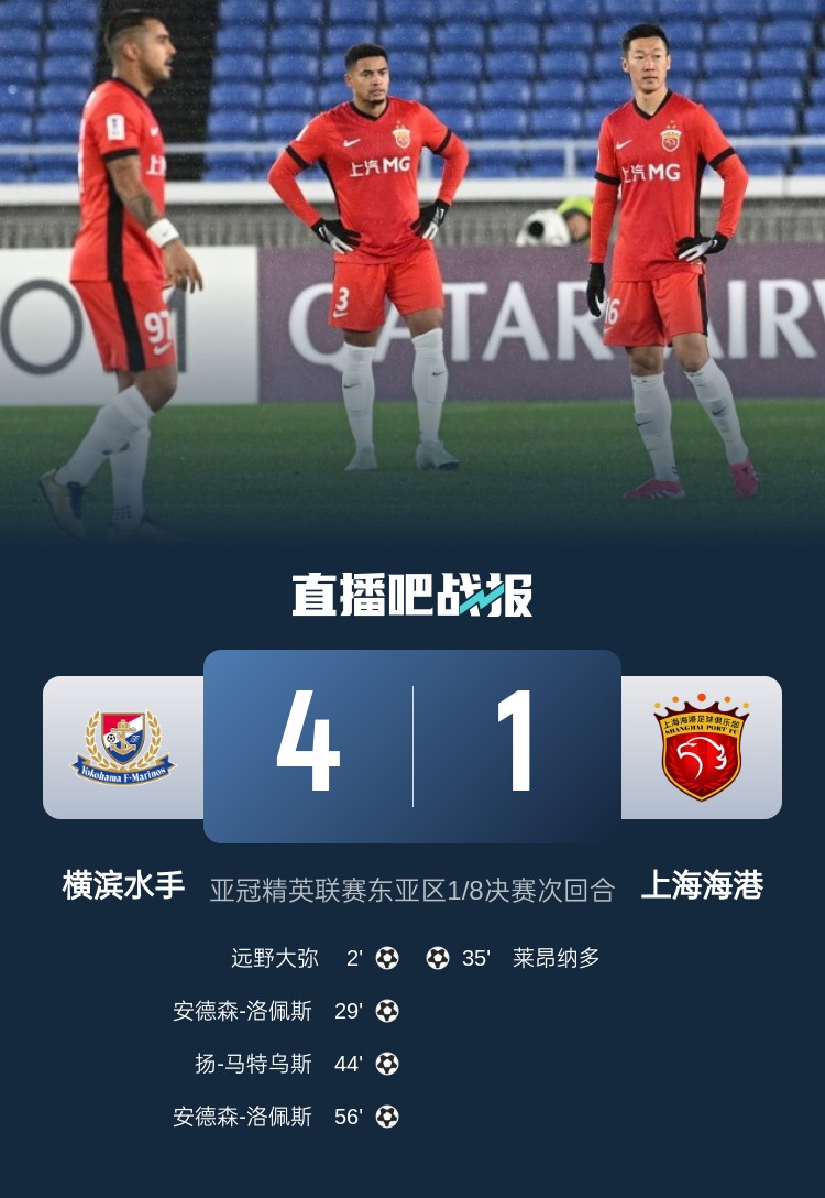 03月12日訊 亞冠精英聯賽東亞區1/8決賽次回合,上海海港客場1-4慘敗橫濱水手,兩回合1-5被淘汰。