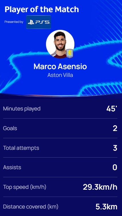 本場(chǎng)比賽替補(bǔ)登場(chǎng)的阿森西奧梅開二度,3次射門,跑動(dòng)距離5.3km,賽后他也當(dāng)選歐冠官方評(píng)選出的本場(chǎng)最佳球員。