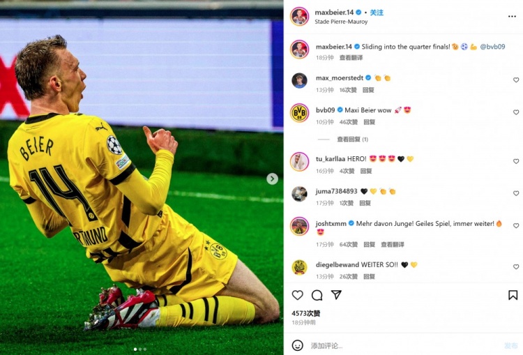 拜爾也曬出自己進球后的滑跪慶祝照,并調侃:“一路滑進歐冠八強!?????????? @多特蒙德俱樂部”。