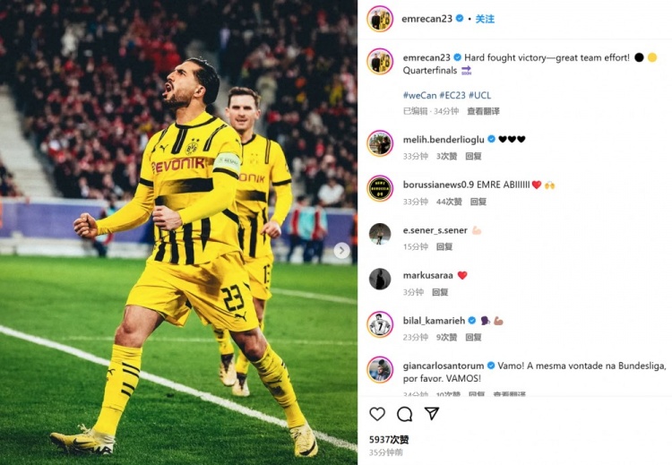 埃姆雷-詹也在賽后通過社媒曬出了自己的怒吼慶祝照,并配文:“全隊努力鏖戰贏下勝利??????歐冠八強戰????”