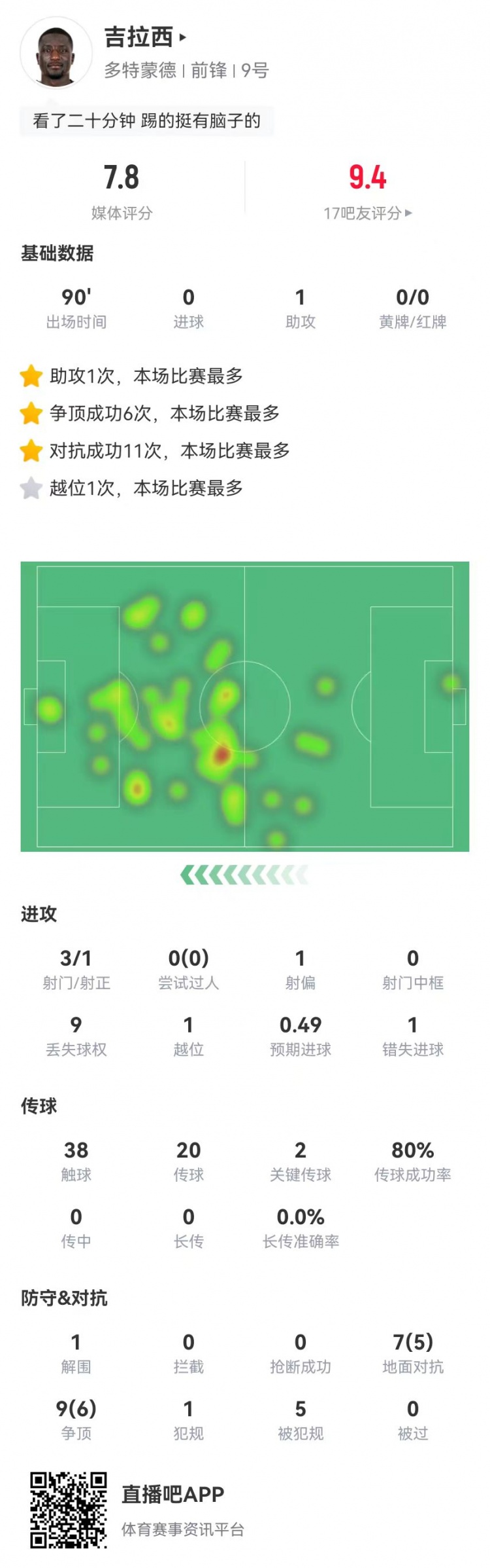 3月13日訊 多特在本輪歐冠2-1擊敗里爾,吉拉西本場(chǎng)數(shù)據(jù)如下: