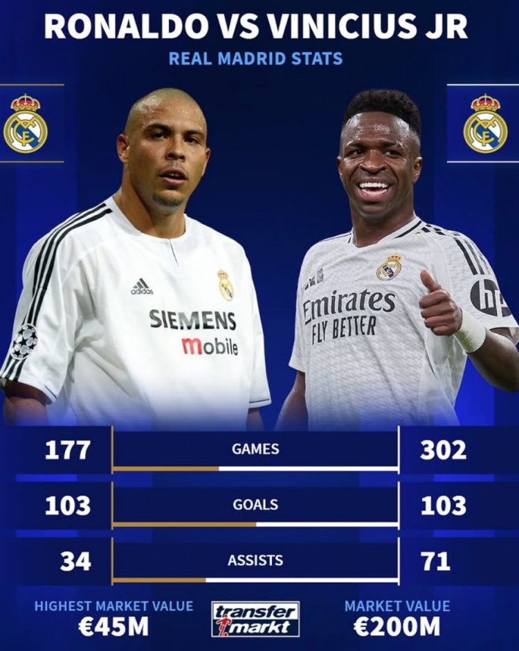 羅納爾多為皇馬出戰177場,貢獻103球34助攻,巔峰德轉身價4500萬歐。維尼修斯則在302場為皇馬貢獻103球71助攻,巔峰德轉身價2億歐。