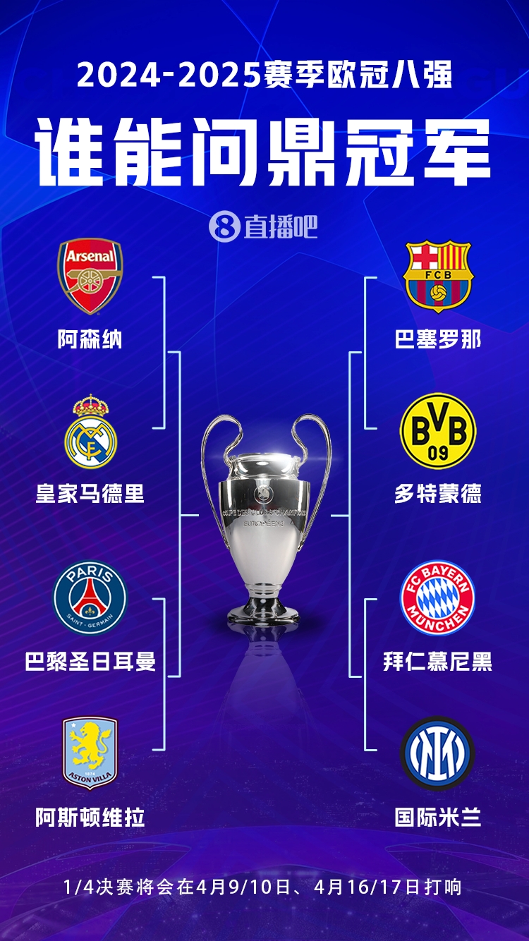 03月13日訊 歐冠8強今天凌晨全部出爐,上半區的4強分別是阿森納、皇馬、巴黎和維拉,下半區則是巴薩、多特、拜仁和國米。