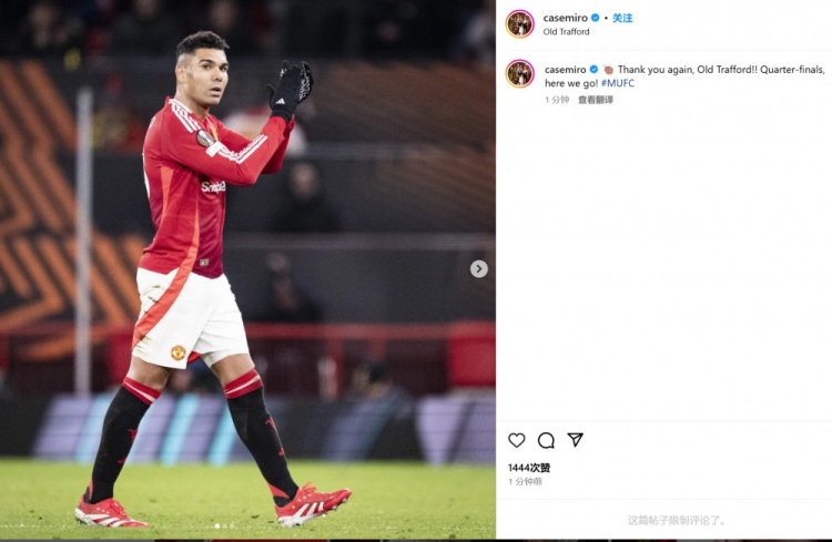 卡塞米羅也在被換下場時回報以掌聲,賽后還通過社媒曬出照片并配文:“再次感謝,老特拉福德!!!歐聯杯八強戰,我們來了!”