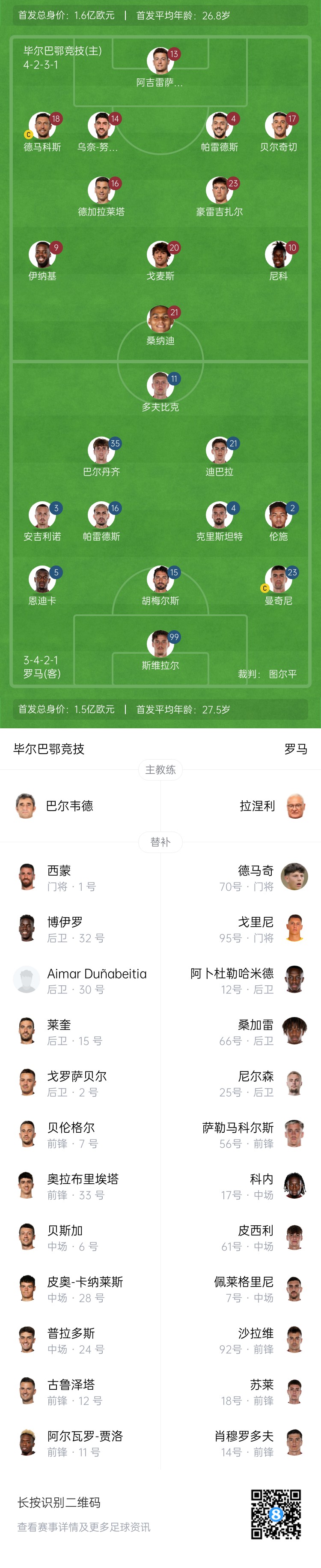 羅馬首發:99-斯維拉爾、5-恩迪卡、15-胡梅爾斯、23-曼奇尼、3-安吉利諾、16-帕雷德斯、4-克里斯坦特、2-倫施、35-巴爾丹齊、21-迪巴拉、11-多夫比克