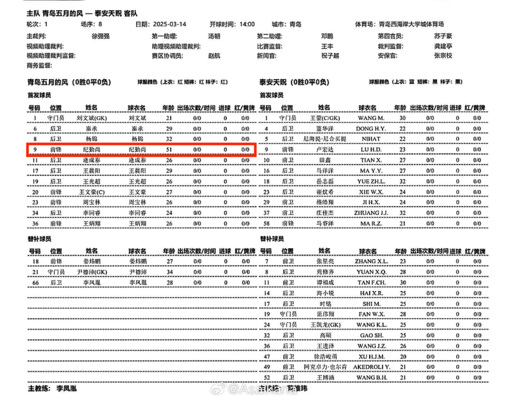 中冠球隊青島五月的風將對陣中乙球隊泰安天貺。根據首發名單,青島五月的風投資人、51歲的紀勤尚將先發出戰,擔任前鋒。 ???